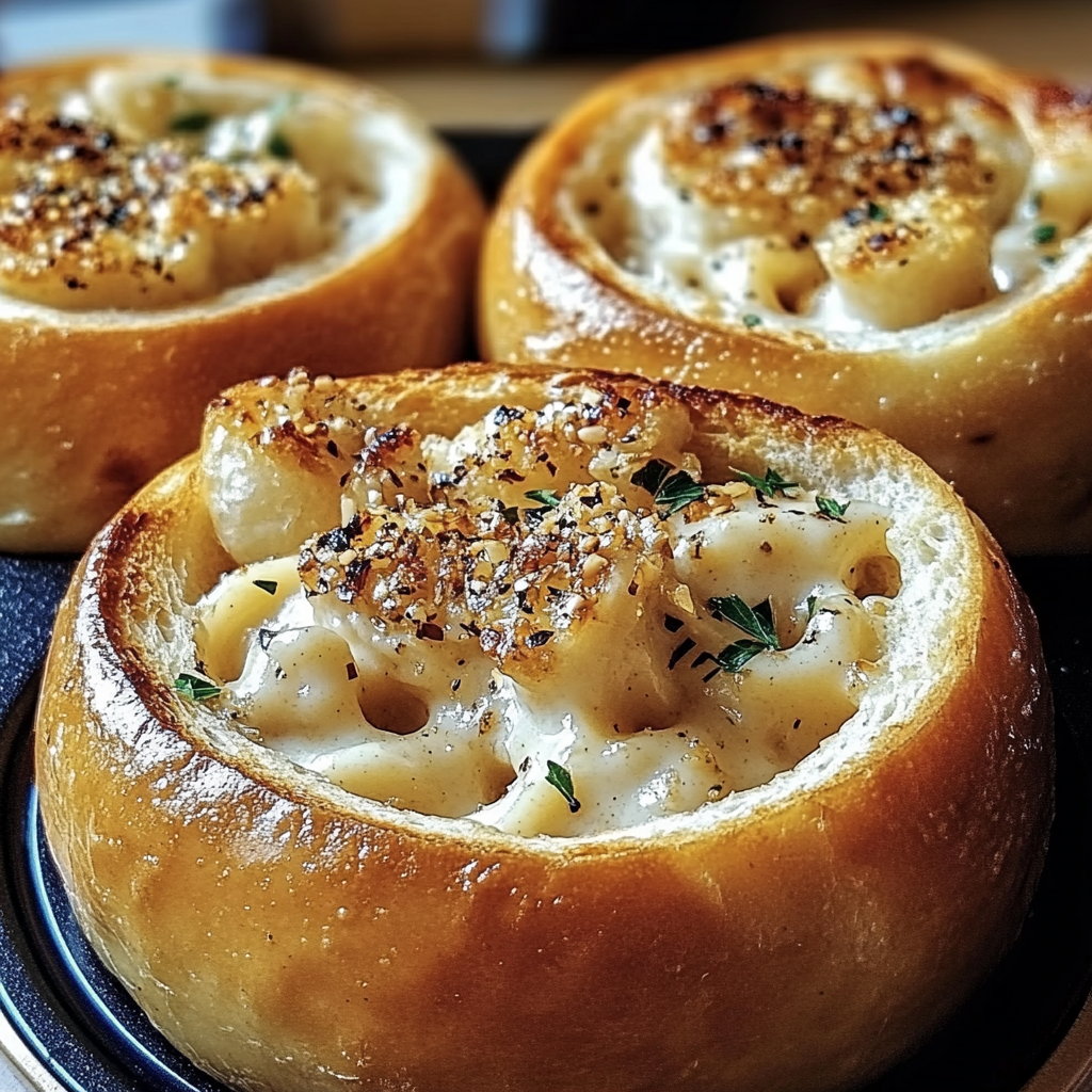 Prep the Bread Bowls: Preheat oven to 375°F (190°C). Slice tops off the bread and hollow out each loaf, leaving a ½-inch shell. Brush inside with butter and minced garlic. Bake for 10 minutes until slightly crisp.