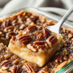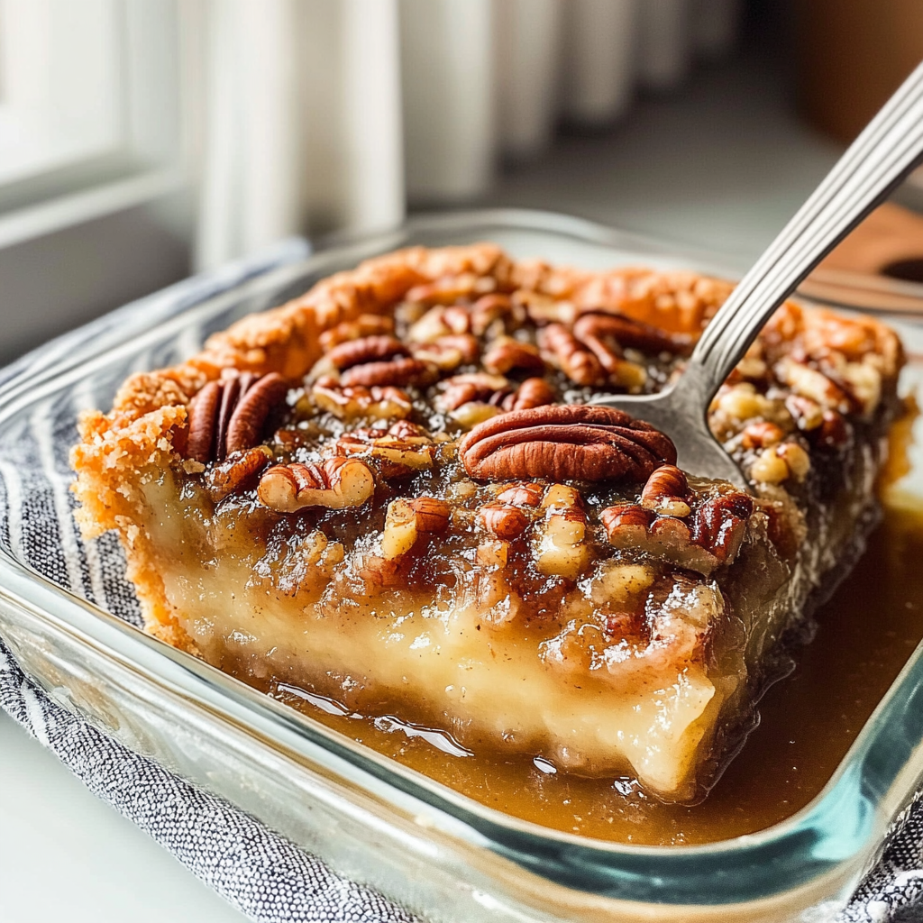 The middle bakes into a sweet, caramel-like filling that tastes almost identical to traditional pecan pie but with a soft, custardy texture.
